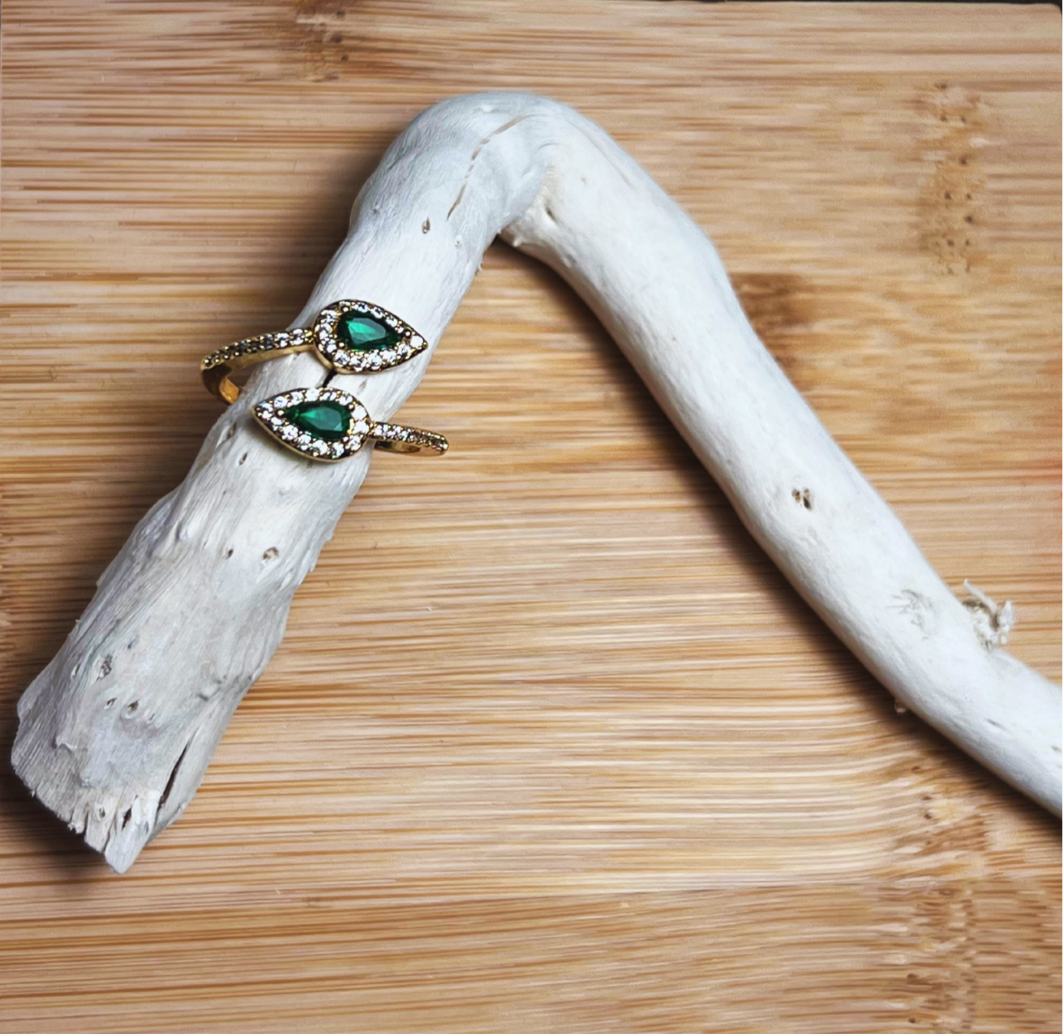 Découvrez cette bague, un bijou unique qui arbore deux pierres en zirconium (grande résistance) en forme de gouttes finement taillées pour capturer la lumière avec éclat d'un vert profond serties dans cette bague en plaquée or.